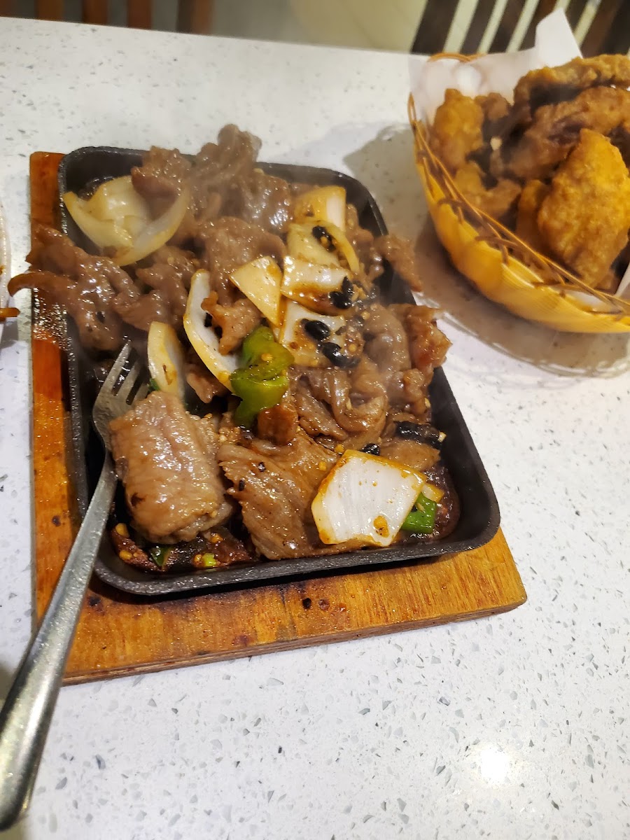 The menu leans heavily into savory, bold options like hot sizzling plates featuring beef tenderloin with black pepper or chicken with black bean sauce, alongside island-style BBQ chicken legs and spicy seafood dishes like hot & spicy shrimp or squid. The “Can You Find the Chicken” challenge hints at playful portion sizes focusing more on the protein than filler like rice, which adds real value for hungry customers.